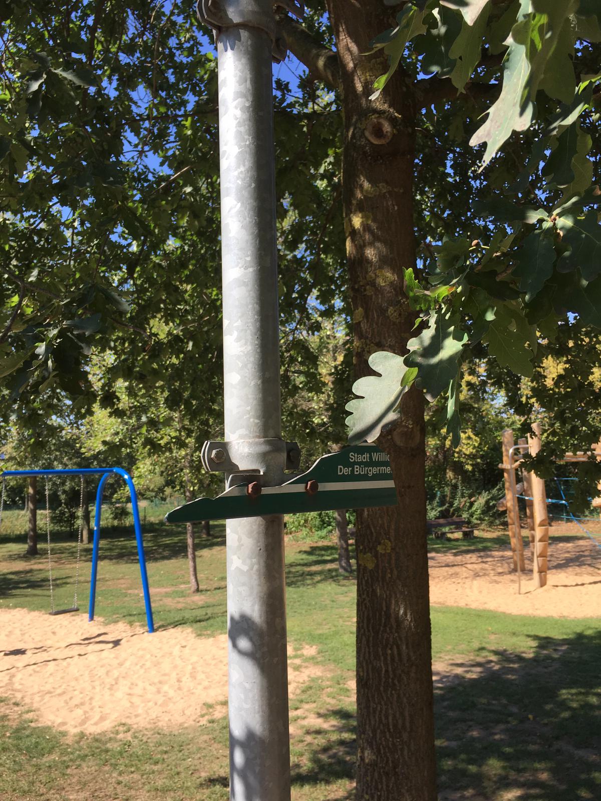 Im angrenzenden Park fanden sie ein zerstörtes Hinweisschild sowie zugewachsene Mülleimer vor.